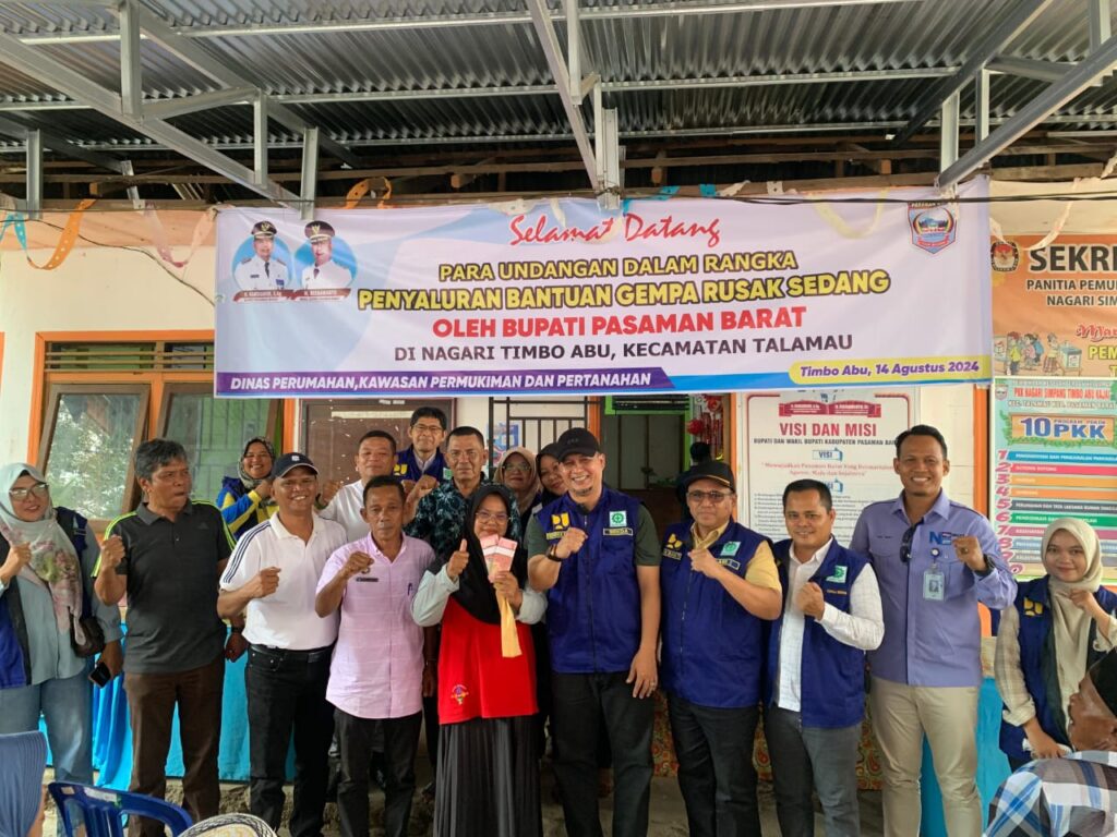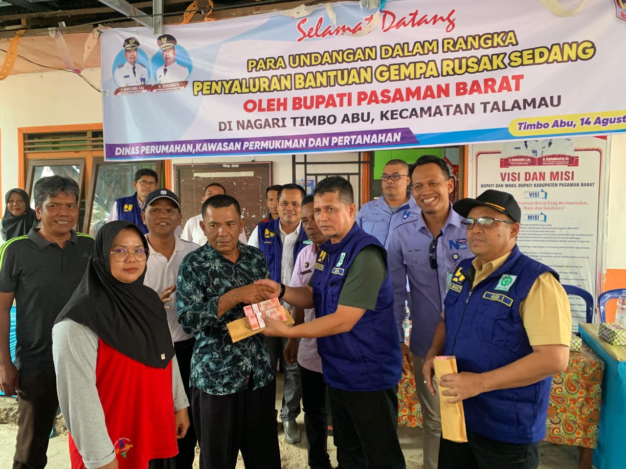Pasbar kompasnews.co.id Sekretaris Daerah (Sekda) Hendra Putra menyerahkan secara simbolis bantuan untuk rumah rusak sedang yang terdampak gempa bumi kepada 72 Kepala Keluarga (KK) di Nagari Timbo Abu, Kajai, Kecamatan Talamau Rabu 14 Agustus.