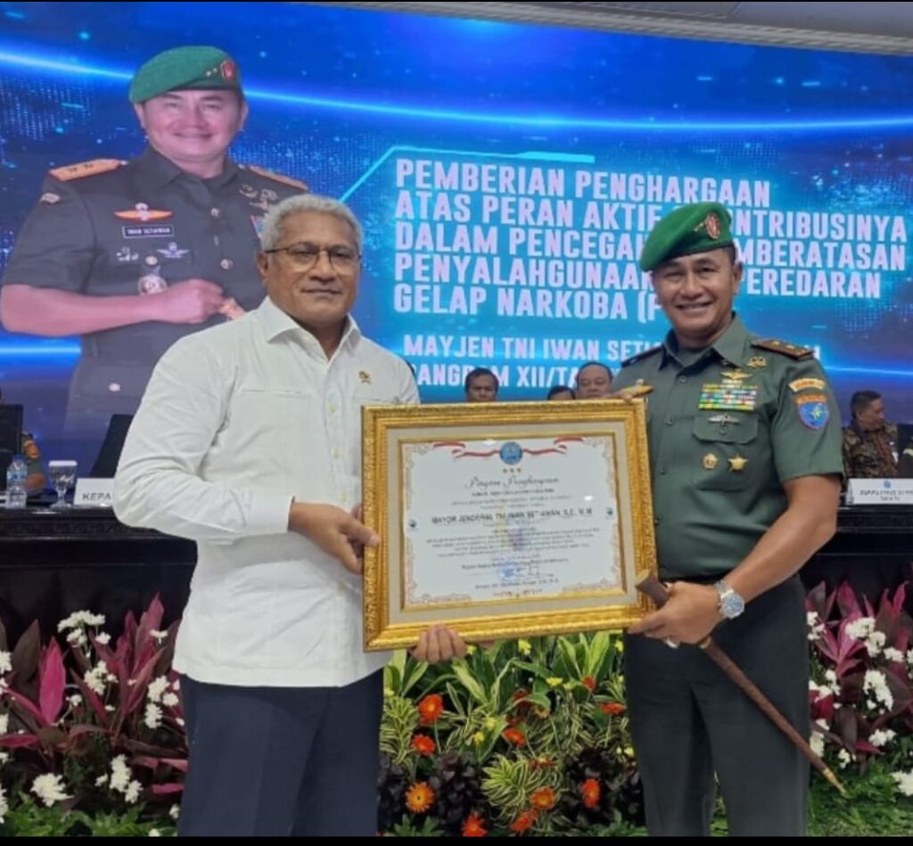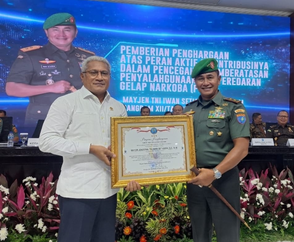 Mayjen TNI lwan Setiawan menerima penghargaan dari BNN RI, atas peran aktif dan kontribusinya dalam pencegahan dan Pemberantasan Penyalahgunaan dan peredaran Narkotika ( P4GN ) dengan barang bukti sabu seberat 88.233,36 Gram, Ekstasi sebanyak 38.342 butir, matedron sebanyak 38.087 butir yang diselundupkan melalui Wilayah Perbatasan Kalimantan Barat Tahun 2024.