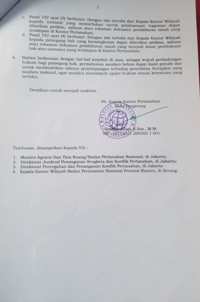 “Kami meminta kepada Menteri ATR/Kepala BPN dan Kakanwil BPN Banten untuk segera mengumumkan status tanah tersebut dan meninjau apakah sertifikat yang diterbitkan BPN Kota Tangerang harus segera dibatalkan,” ujar Usman dengan tegas.