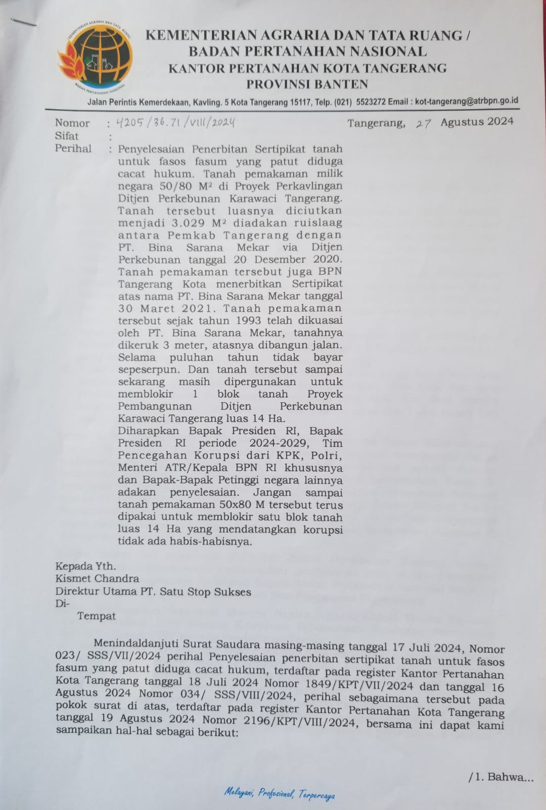 Tangerang kompasnews.co.id | Kasus dugaan tindak pidana korupsi kembali mencuat, kali ini terkait dengan penerbitan sertifikat tanah fasilitas sosial (fasos) dan fasilitas umum (fasum) oleh Badan Pertanahan Nasional (BPN) Kota Tangerang. Berdasarkan surat dari Kementerian Agraria dan Tata Ruang/BPN nomor 4205/36.71/VIII/2024 tanggal 27 Agustus 2024, yang merupakan tanggapan atas surat dari PT Satu Stop Sukses nomor 023/SSS/VII/2024 dan nomor 034/SSS/VIII/2024, terdapat indikasi ketidaksesuaian yang serius dalam proses penerbitan sertifikat tersebut.