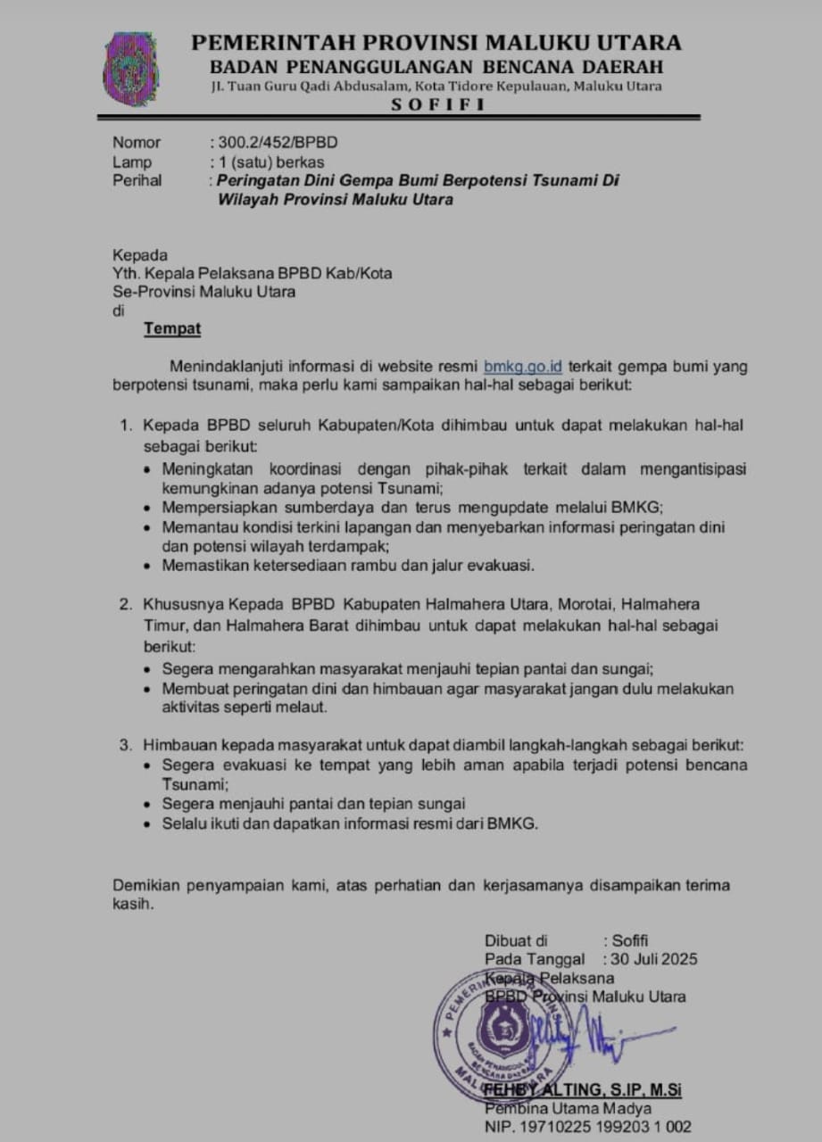Kompasnews.com — Malut – Badan Penanggulangan Bencana Daerah (BPBD) Provinsi Maluku Utara resmi mengeluarkan surat peringatan dini terkait gempa bumi yang berpotensi tsunami di wilayah Provinsi Maluku Utara. Surat yang ditandatangani Kepala Pelaksana BPBD Provinsi Maluku Utara, Febby A. Alting, S.IP., M.Si, tertanggal 30 Juli 2025, ditujukan kepada seluruh BPBD kabupaten/kota se-Maluku Utara.