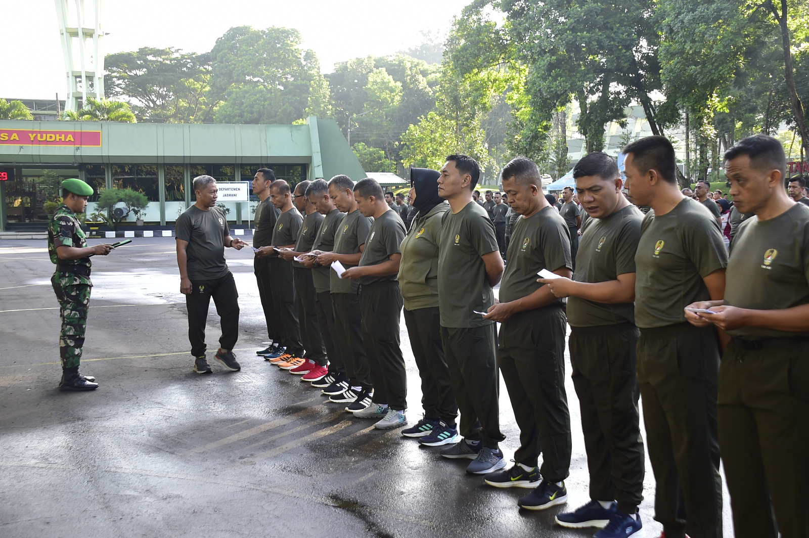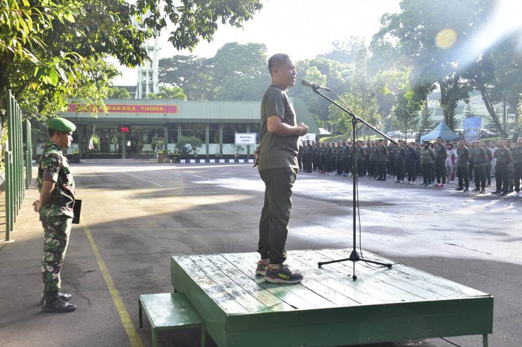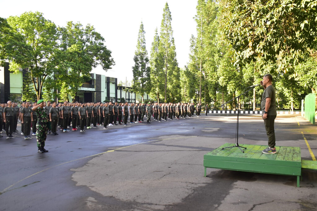 Gubernur Akademi Militer Mayjen TNI Legowo W.R. Jatmiko, S.I.P., M.M. diwakili Kadeppengmilum Akmil Kolonel Inf Nugroho Dwi Hermawan mengambil apel olah raga bertempat di lapangan Departermen Jasmani Akademi Militer. Jum’at (12/05/2023).