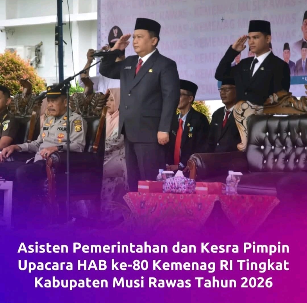 Bupati Musi Rawas Hj. Ratna Machmud diwakili Asisten Pemerintahan dan Kesra Agus Susanto menghadiri Upacara Hari Amal Bhakti (HAB) ke-80 Kementerian Agama Republik Indonesia Tahun 2026. Dalam Upacara tersebut, Agus Susanto menjadi pembina Upacara dan membacakan sambutan Menteri Agama.