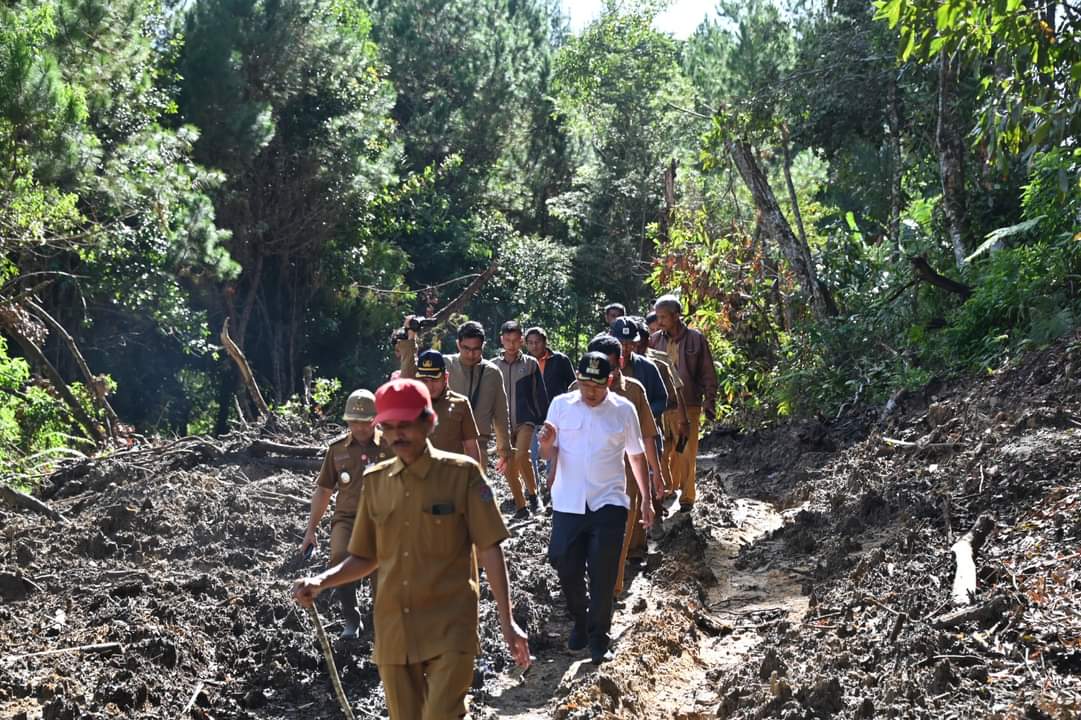 Bupati bersama rombongan berjalan menelusuri sepanjang jalan hingga sampai tepat di atas lokasi kejadian longsor di Baktiraja.