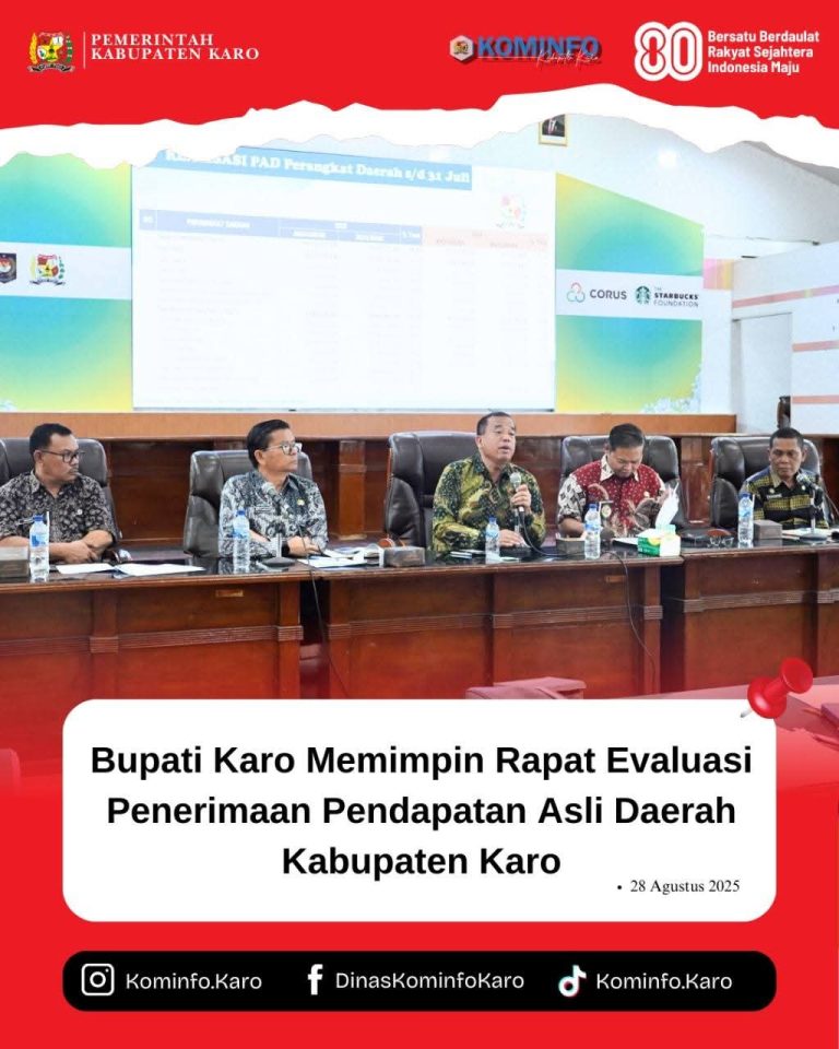 Tanah Karo: Kompasnews.co.id Bupati Karo Brigjen Pol (Purn) Dr.dr. Antonius Ginting, Sp.OG, M.Kes., didampingi oleh Wakil Bupati Karo, Komando Tarigan, S.P., dan PJ. Sekda Karo, Dr. Drs Eddi Surianta Surbakti, Mpd., memimpin Rapat Evaluasi Penerimaan Pendapatan Asli Daerah (PAD) Kabupaten Karo. Rapat ini dilaksanakan pada tanggal 28 Agustus 2025 di Aula Kantor Bupati Karo.