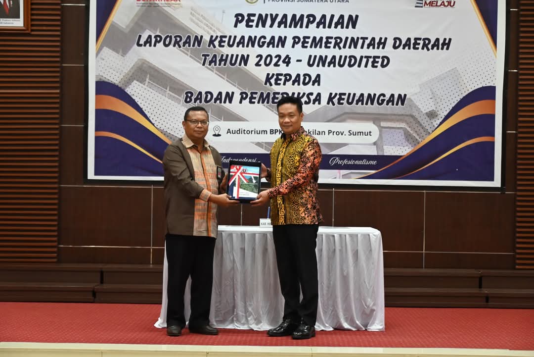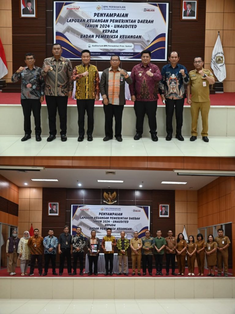 Bupati Humbahas Dr Oloan P Nababan SH MH didampingi Sekda Chiristison Rudianto Marbun M.Pd, Kepala BPKPD Drs John Harry M. MA, Plt Inspektur De Zon Franatha Situmeang ST, Kadis Kominfo Batara F Siregar SE, Plt Kadis Pendidikan Martahan Panjaitan dan lainnya serahkan laporan Keuangan Unaudited Pemerintah Kabupaten Humbahas tahun anggaran 2024 ke BPK RI Perwakilan Sumut, Selasa 25 Maret 2025 di Jalan Imam Bonjol Medan. Laporan keuangan itu diterima Kepala Perwakilan Badan Pengawas Keuangan (BPK) RI Perwakilan Sumut Paula Henry Simatupang SE.