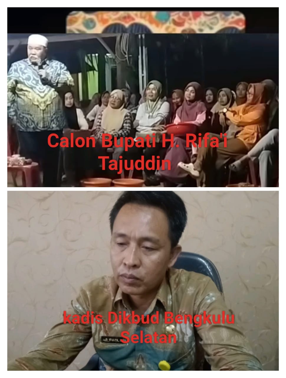 Pada tayangan vidio yang dibagikan akun Facebook yang bernama Heri Asmadi pada tanggal (25/09/24) jam 23.00 wib. terlihat dan terdengar jelas seorang warga mengeluh dan bertanya kepada Calon Bupati dan Wakil Bupati Rifa’i Tajuddin dan Yevri Sudianto. Katanya sekarang mau dibetuk satu desa satu sarjana sedangkan anak kami sudah sarjana semua tapi lapangan pekerjaan tidak tersedia. Kalau bapak jadi Bupati dan Wakil Bupati nanti untuk Masalah penerimaan dan penempatan Pegawai Negeri Sipil dan P3K prioritaskan yang sudah mengabdi jangan mengambil yang belum-belum. Saya punya 2 anak Sarjana ikut tes P3K kalah nilai koma satu angka karena kalah dengan Titik-titik.
