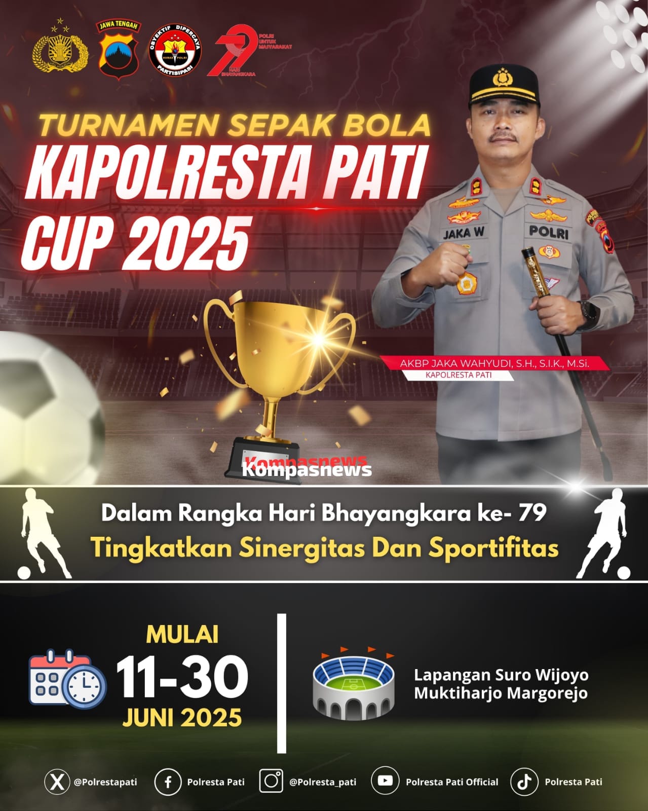 Kapolresta Pati AKBP Jaka Wahyudi berharap melalui turnamen ini dapat mempererat tali persaudaraan dan turnamen ini diselenggarakan guna memeriahkan HUT Bhayangkara serta meningkatkan pembinaan sepak bola sebagai peningkatan kualitas olah raga yang ada di Kabupaten Pati. “Datang dan saksikan, gratiiis tidak dipungut biaya.” Imbuhnya ( wwhyu )