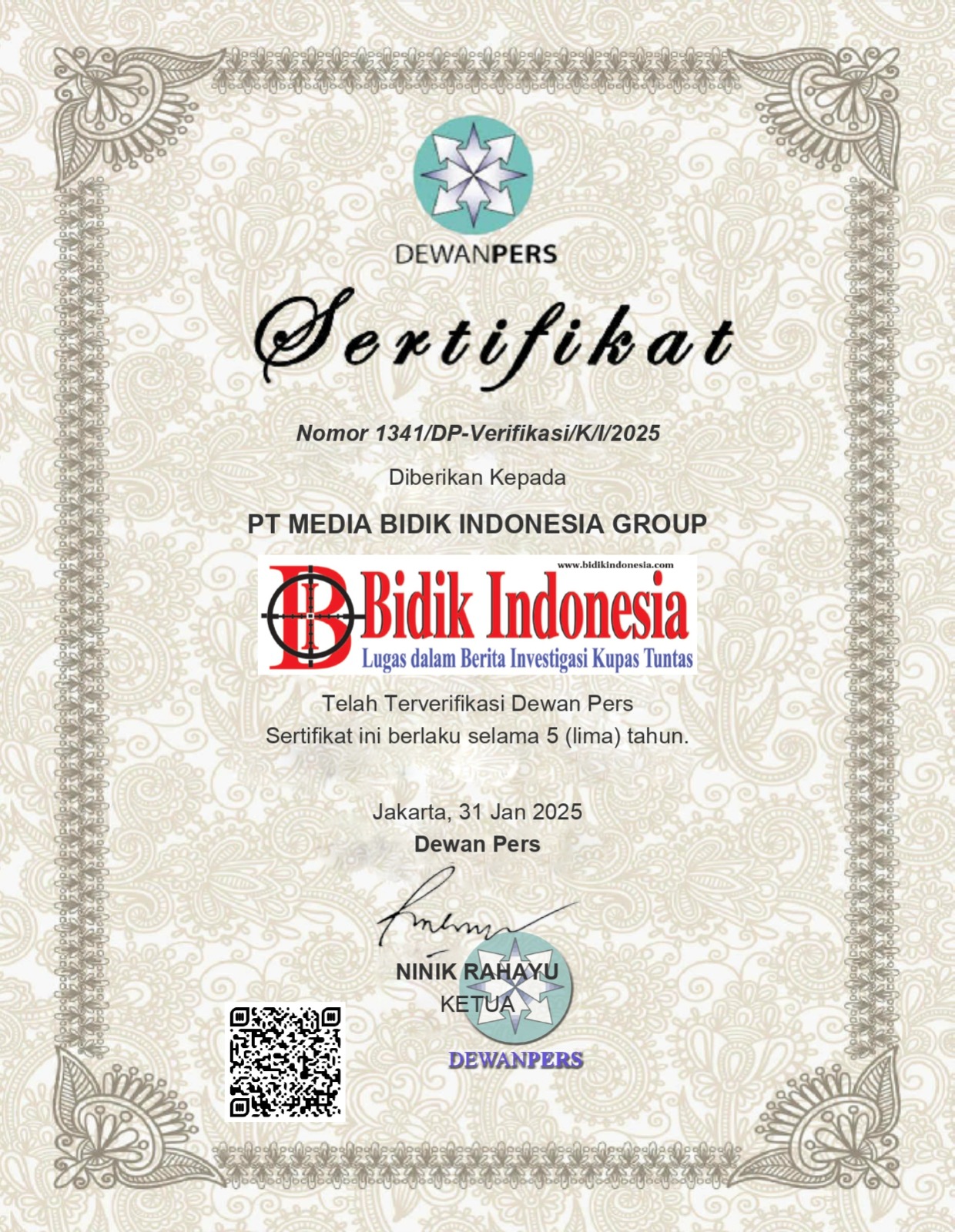 Hal itu sejalan dengan diterbitkannya sertifikat verifikasi oleh Dewan Pers kepada Bidik Indonesia, Senin, (03/02/2025), di Jakarta. Sertifikat bernomor 1341/DP-Verifikasi/K/I/2025, tertanggal 31 Januari 2025 tersebut ditandatangani langsung oleh Ketua Dewan Pers, Ninik Rahayu.
