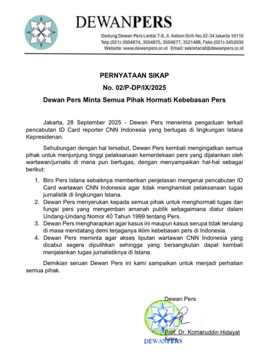 Jakarta, – Dewan Pers secara resmi mengeluarkan pernyataan sikap terkait laporan pencabutan ID Card seorang reporter CNN Indonesia yang bertugas di lingkungan Istana Kepresidenan. Pernyataan tersebut disampaikan pada 28 September 2025 melalui surat resmi bernomor 02/P-DP/IX/2025.