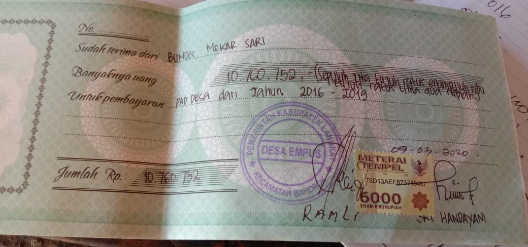 Penyerahan PAD Desa dari tahun 2016 sampai 2019. Diterima kades dengan tanda bukti kwitansi bermaterai .serta tanda tangan beliau sebagai kades ,sekaligus Penerima kwitansi tanda terima jumlah PAD Desa Empus dari tahun 2016 sampai2019.