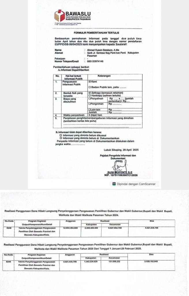 Ketua Umum LSM P2NAPAS Perkumpulan Pemuda Nusantara Pas Aman Ahmad Husein Batu Bara meminta laporan Penggunaan Anggaran Pilkada dan PSU Pada Badan Pengawas Pemilu Kabupaten Pasaman Tahun Anggaran 2024-2025.