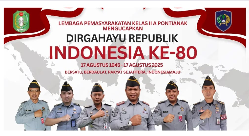 Pontianak,Kalbar –Menjelang peringatan Hari Kemerdekaan Republik Indonesia ke-80 pada 17 Agustus 2025, Kalapas Kelas IIA Pontianak, Provinsi Kalimantan Barat, Bapak Zaini beserta jajaran menyampaikan ucapan selamat dengan penuh rasa bangga dan syukur. Tema peringatan tahun ini, “Bersatu Berdaulat, Rakyat Sejahtera, Indonesia Maju”, menjadi pesan penting bahwa persatuan dan kedaulatan adalah kunci untuk mewujudkan kemajuan bangsa.