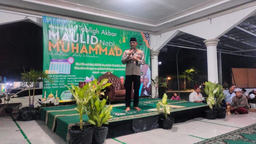 Bekasi – Kapolsek Cikarang Pusat, AKP Usep Aramsyah, SH., MH. Sampaikan pesan-pesan kamtibmas disela-sela acara peringatan Maulid Nabi Besar Muhammad SAW yang digelar masyarakat di Masjid Raya An Nuur, Desa Cicau, Kab Bekasi, Minggu (15/9/24).