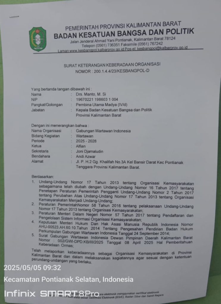 Pontianak, Kalbar – Dewan Pimpinan Daerah (DPD) Gabungan Wartawan Indonesia (GWI) Kalimantan Barat resmi menerima surat tanda terima keberadaan GWI di Provinsi Kalimantan Barat. Penyerahan surat tersebut dilakukan langsung oleh Kepala Badan Kesatuan Bangsa (Kesbangpol) Provinsi Kalimantan Barat ,Drs. Manto,M.Si, melalui Kasi Pelayanan Publik Provinsi Kalimantan Barat,Santi,SE, M.AP, pada Senin, 5 Mei 2025.