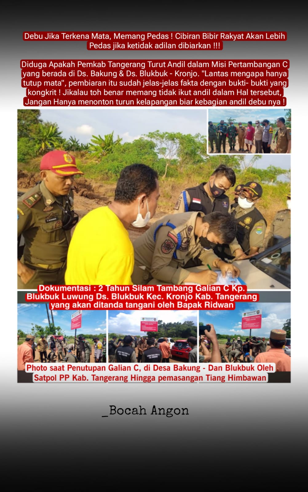 Arul juga menambahkan,” Menurut data analisis dokumen yang ada serta dengan bukti yang kongkrit, dari semenjak 2 tahun silam sampai sekarang, penutupan galian C di Desa Blukbuk dan Desa Bakung Kecamatan Kronjo Kabupaten Tangerang, selalu buka tutup terus, 2 pemilik galian c tersebut semakin berani , sampai saat ini masih berjalan dengan aman dan terkesan kebal akan hukum”, tutup bang Arul.
