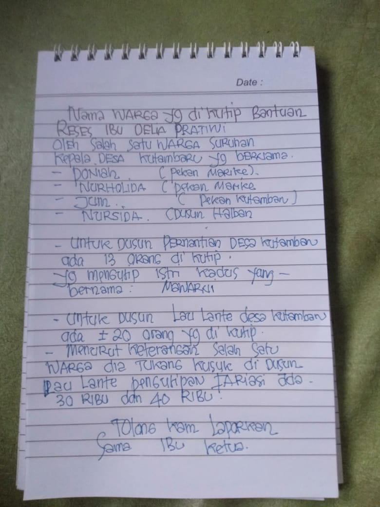 Warga yang tidak mau disebutkan nama nya menyerahkan selembar kertas yg berisikan data sebagian nama, dan asal dusun nya kepada awak media.