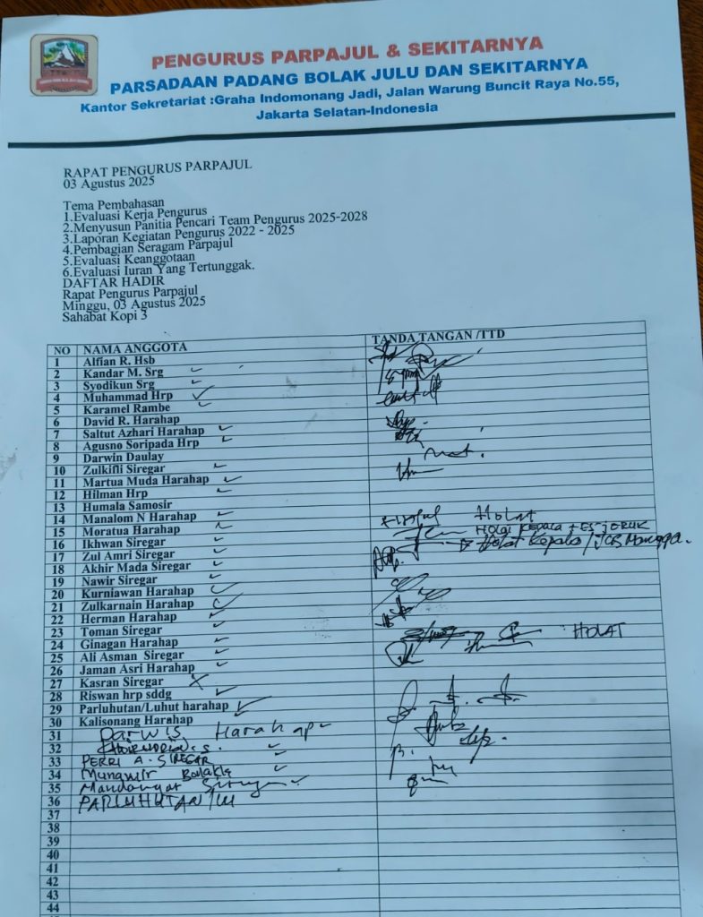 Bogor Kompasnews|| Rapat pengurus PARPAJUL yang dihadiri Ketua umum, Alfian Rusdi Hasibuan sekretaris dan bendahara, dan pengurus lainya serta anggota PARPAJUL, membahas laporan kepengurusan Periode tahun 2023-2025 dan pemilihan ketua umum, sekretaris dan bendahara kepengurusan tahun 2925-2928.