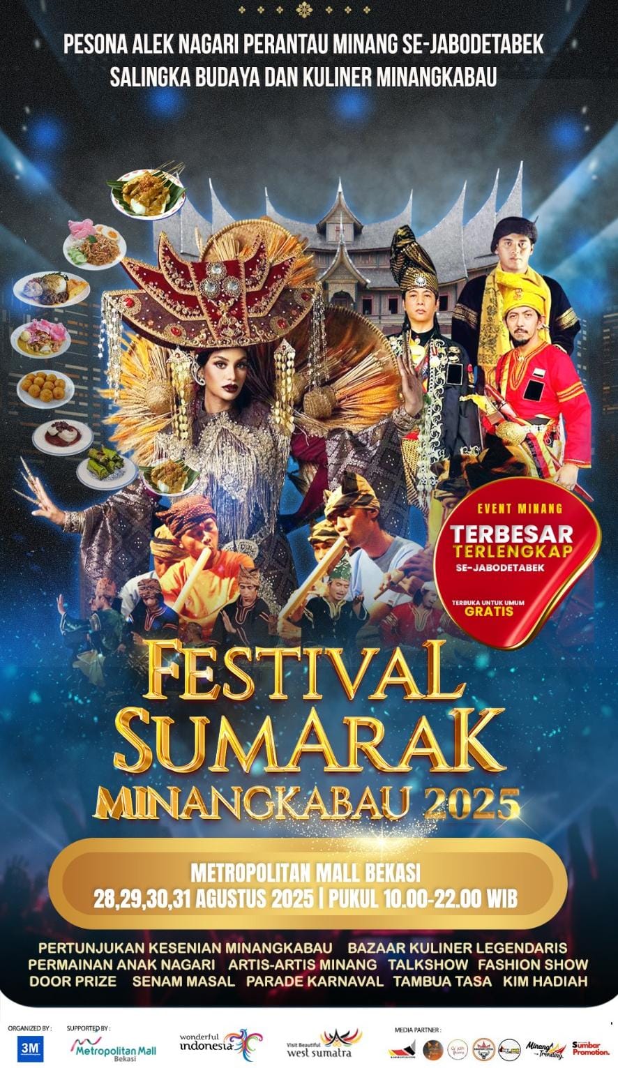 Untuk pertama kalinya, kemegahan budaya Minangkabau akan hadir di Kota Bekasi melalui Festival Sumarak Minangkabau 2025. Acara yang digelar Komunitas Muda Mudi Minangkabau se-Jabodetabek ini akan berlangsung selama 4 hari penuh, mulai 28 hingga 31 Agustus 2025 di Metropolitan Mall Bekasi. Menariknya, festival ini terbuka untuk umum dan gratis masuk.