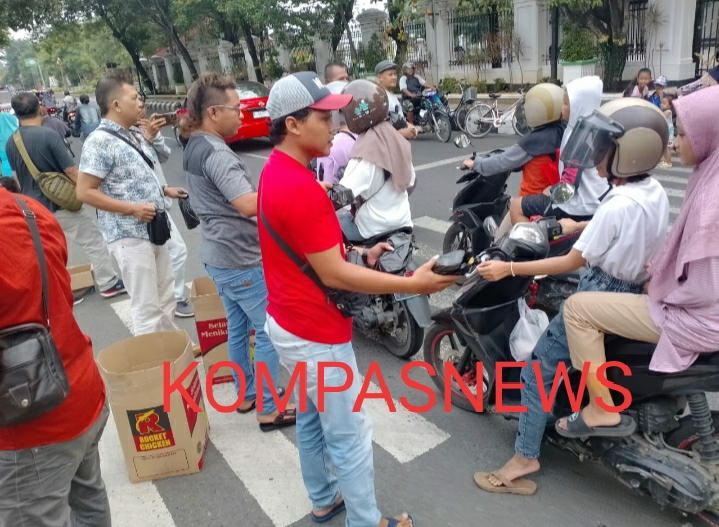 Tampak, ratusan pengguna jalan berdesak-desakan mengantri di depan Gedung DPRD Pati untuk mendapatkan takjil gratis yang berisik menu berbuka puasa seperti makanan dan minuman.