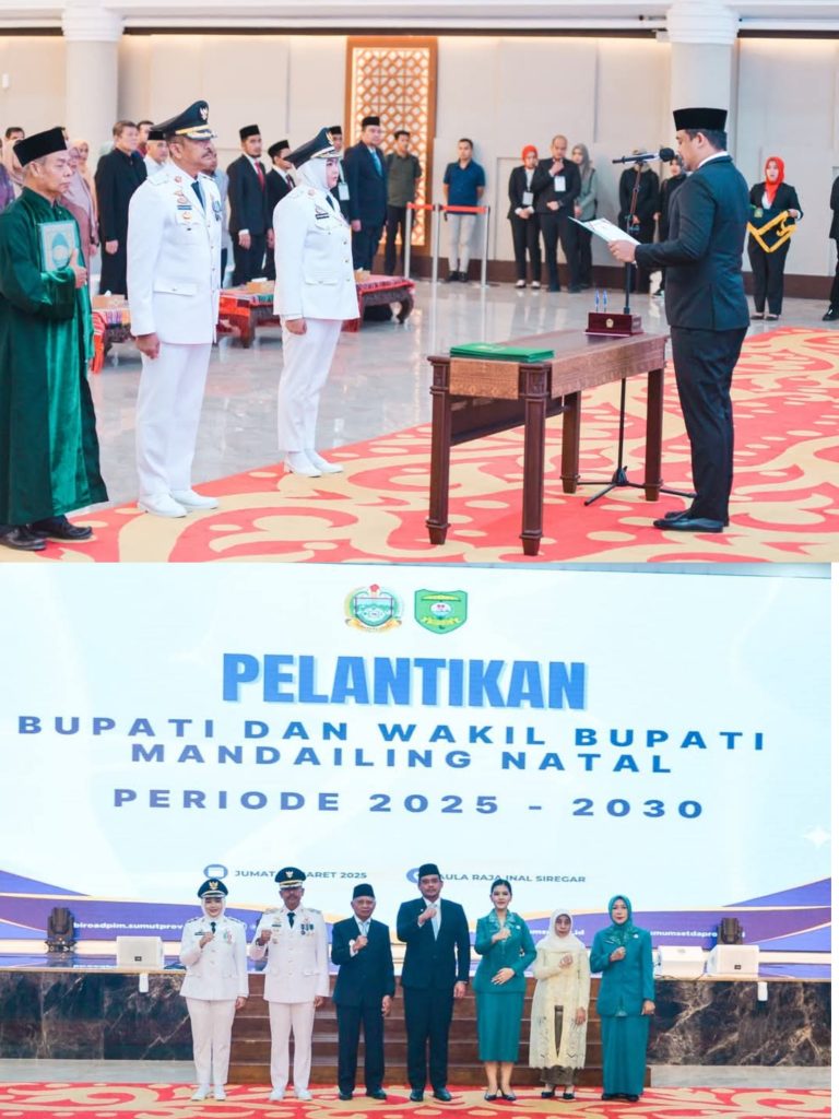 Pelantikan yang berlangsung khidmat itu dihadiri Forkopimda Sumut dan Madina, kepala OPD dua pemerintahan tersebut, keluarga bupati dan wakil bupati, para ketua partai pendukung maupun pengusung, dan undangan.