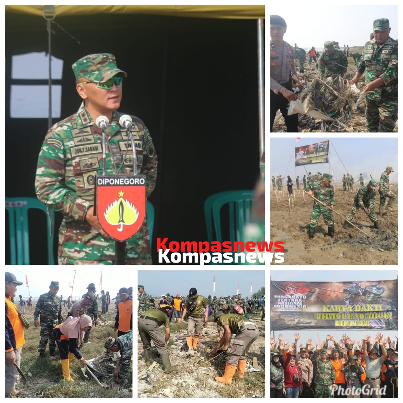 PATI-Kodim 0718/Pati menggelar kegiatan karya bakti dengan menggandeng berbagai elemen untuk bersama-sama membersihkan pesisir pantai desa Bulumanis kecamatan Margoyoso kabupaten Pati Jawa Tengah dari sampah-sampah yang terbawa oleh arus air pasang serta ombak sehingga bertebaran di sepanjang pantai.