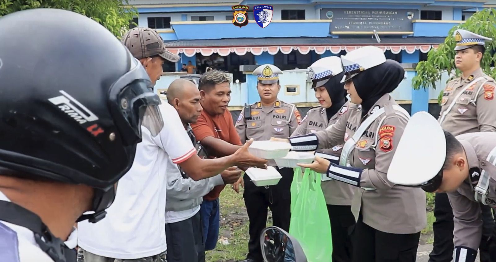 Sebagai wujud kepedulian terhadap masyarakat, Direktorat Lalu Lintas Polda Maluku Utara menggelar program Polantas Peduli dengan membagikan makanan siap saji kepada warga, para buruh pelabuhan dan ojek pangkalan di kawasan Pelabuhan Semut, Kelurahan Mangga Dua, Kota Ternate, Jumat (23/5).