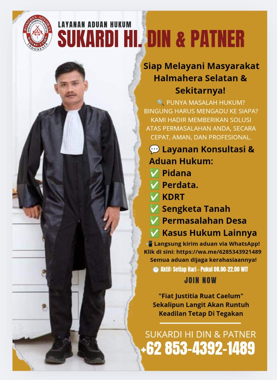 Kompasnews. | Halsel – Dalam rangka memberikan akses hukum yang cepat dan terpercaya bagi masyarakat Halmahera Selatan, Kantor Hukum Sukardi Hi. Din, SH & Partner resmi membuka Layanan Aduan Hukum. Layanan ini ditujukan untuk membantu masyarakat yang mengalami persoalan hukum namun tidak tahu harus mengadu ke mana.