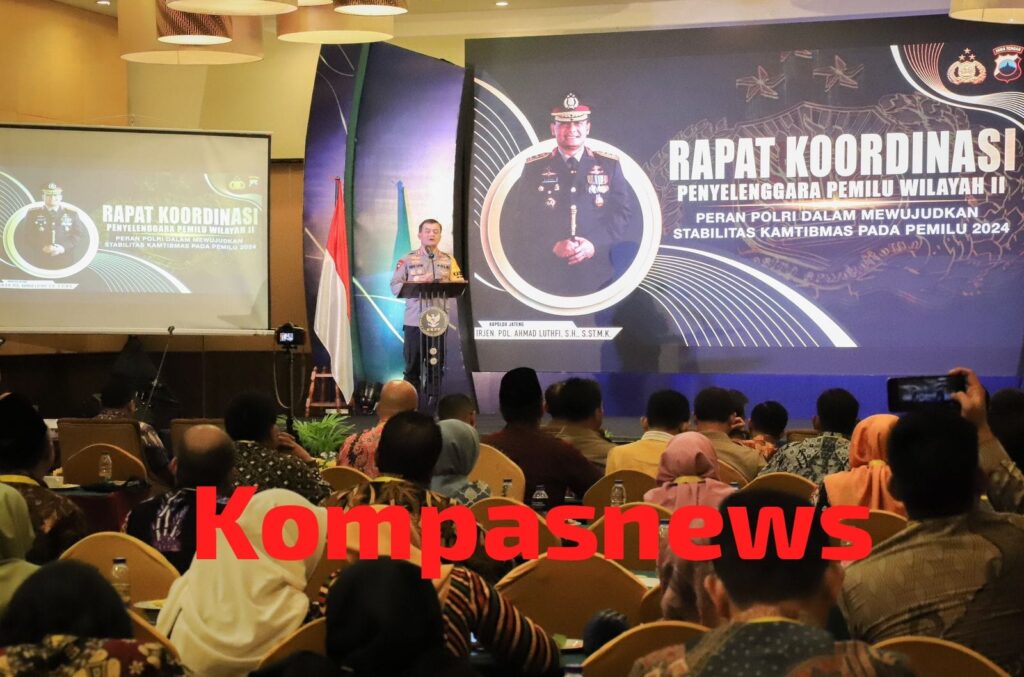 KARANGANYAR – Polda Jateng │Kapolda Jawa Tengah (Jateng) Irjen Ahmad Luthfi memaparkan kesiapan pengamanan Pemilu 2024 dengan operasi Mantap Brata Candi 2023-2024, saat Rapat Koordinasi (Rakor) Penyelenggara Pemilu Wilayah II di Hotel Lor In Kab. Karanganyar. Selasa (14/11/2023).