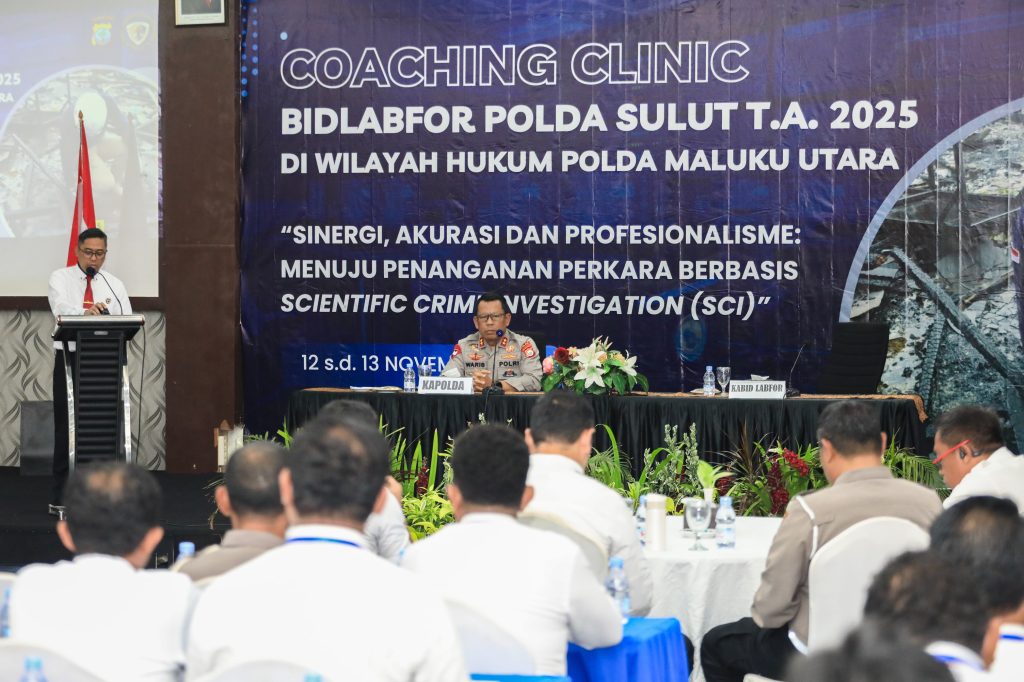 Humas Polri – Kepala Kepolisian Daerah Maluku Utara, Irjen Pol. Drs. Waris Agono, M.Si, menghadiri sekaligus membuka secara resmi kegiatan Coaching Clinic Bidang Laboratorium Forensik (Bidlabfor) Polda Sulawesi Utara T.A. 2025, yang berlangsung di Ballroom Hotel Muara, Rabu (12/11).