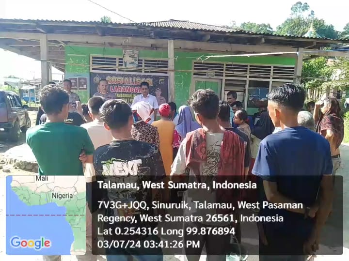 Pada pukul 15.00 Wib Setelah melaksankan patroli dan monitoring aktivitas Tambang emas tanpa izin Kapolsek Talamau IPTU YULI DEKRI SH MH laksanakan sosialisasi terhadap masyarakat Tombang tentang larangan penambangan emas tanpa izin.