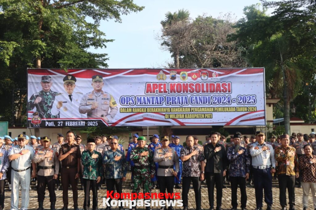 Polresta Pati – Polda Jateng | Polresta Pati menggelar Apel Konsolidasi sebagai tanda berakhirnya rangkaian pengamanan Pemilihan Kepala Daerah (Pilkada) “Operasi Mantap Praja Candi 2024-2025”. Apel yang dipimpin langsung oleh Kapolresta Pati, Kombes Pol. Andhika Bayu Adhittama, ini berlangsung di halaman Mapolresta Pati pada Kamis (27/2) pukul 07.00 WIB.