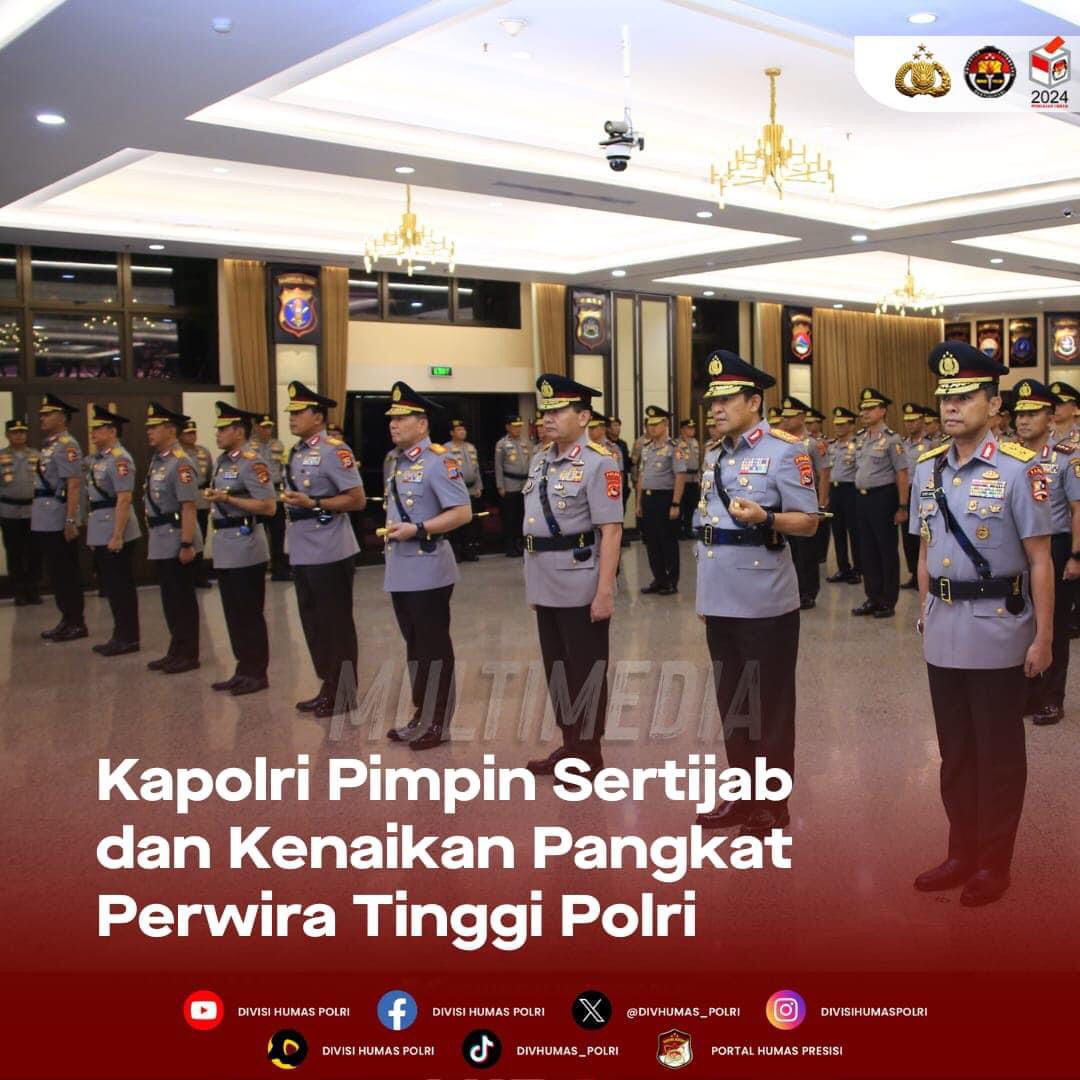 Kapolri Jenderal Polisi Drs. Listyo Sigit Prabowo, M.Si., memimpin Upacara Kenaikan Pangkat atau Korps Raport dan Serah Terima Jabatan (Sertijab) Pejabat Utama Mabes Polri dan Polda. Serangkaian prosesi upacara digelar di Rupattama Mabes Polri, Jakarta Selatan, Sabtu (28/09/24).