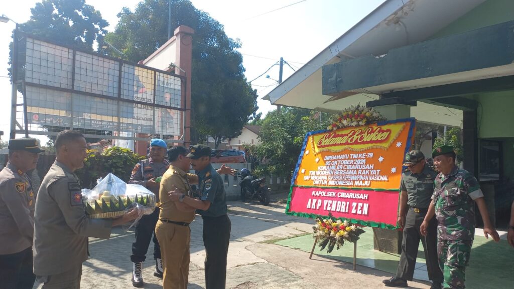 Cibarusah – Dalam rangka memperingati Hari Ulang Tahun (HUT) TNI ke-79, Kapolsek Cibarusah AKP. Yendrizen bersama anggota Polsek Cibarusah dan Camat Rusdi Azis S.ip, beserta staf, menyampaikan ucapan selamat secara langsung kepada jajaran Koramil 09 Cibarusah Jl. Raya Loji No. 1 Cibarusah – Bekasi. pada Senin (7/10/2024). Kunjungan tersebut diterima langsung oleh Danramil 09/Serengan Kapten Inf Iswardi, S.E dan anggotanya.