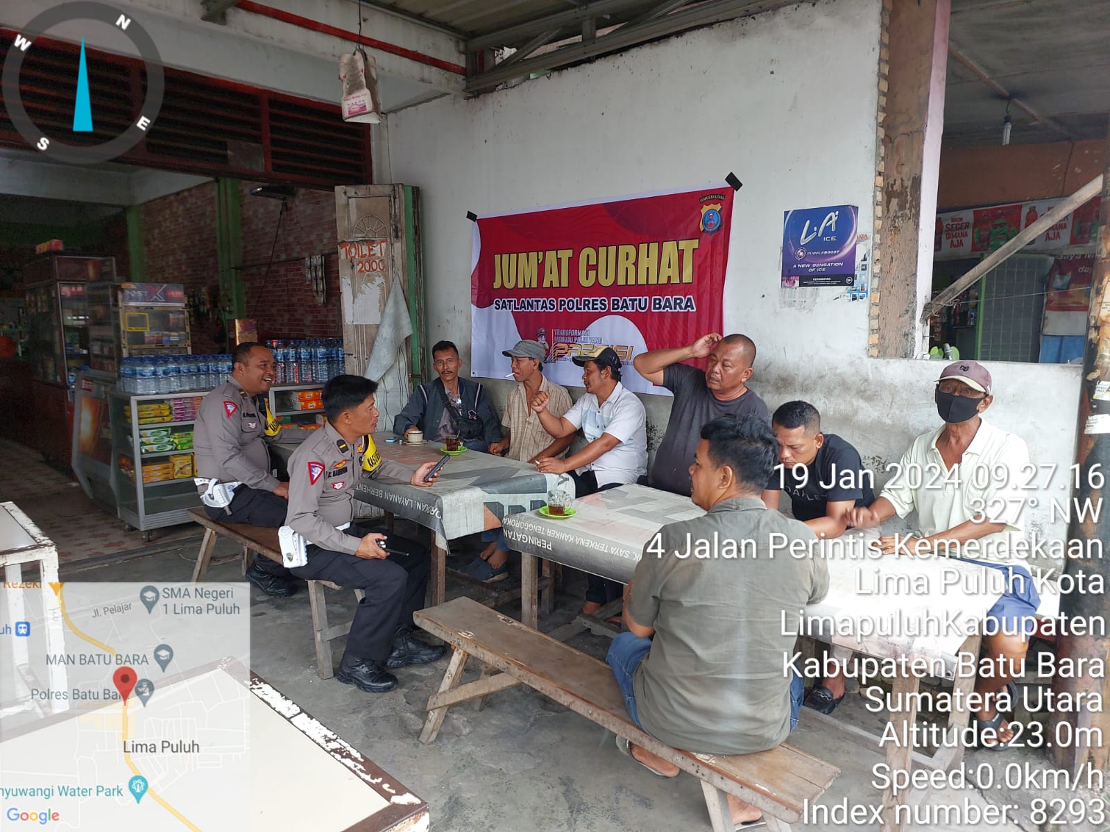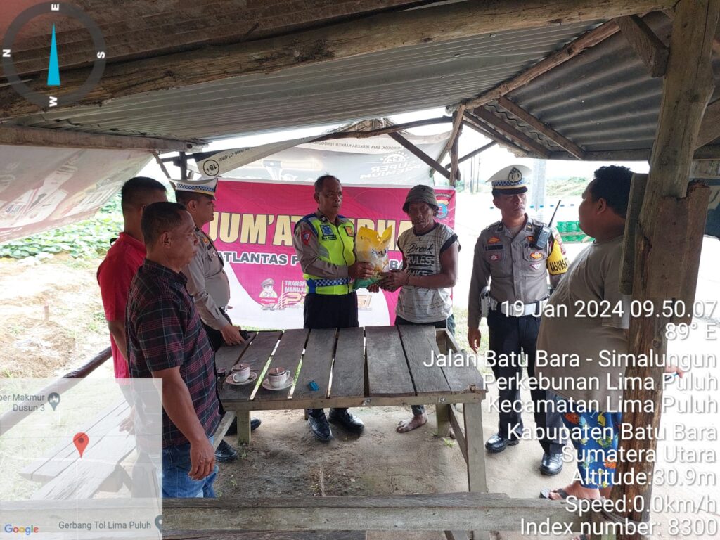 Kompasnews.co.id- Sumatera Utara, Batu Bara- Kasat Lantas Polres Batu Bara AKP Hotlan Wanto Siahaan, SH, Bersama para Kanit serta personil Satlantas Polres Batu Bara, pukul 10.00 wib melaksanakan Giat Jumat Curhat (GJC), sekalian melaksanakan Jumat Sedekah kepada Komunitas Sopir Angkot, dilaksanakan di lingkungan lll Kecamatan Lima Puluh Kabupaten Batu Bara, Jumat, 18/01/2024.