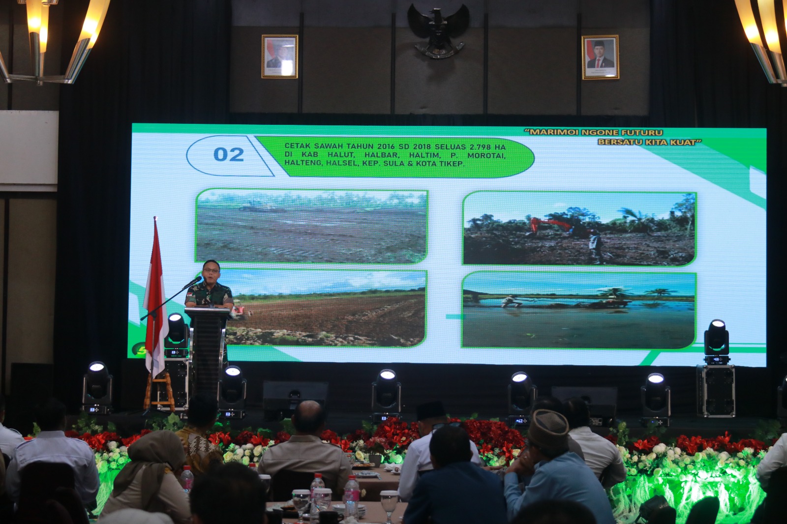 Dalam pemaparannya, Kasrem 152/Baabullah menekankan bahwa TNI memiliki peran strategis dalam mendukung swasembada pangan sebagai bagian dari ketahanan nasional. Ia menjelaskan bahwa Korem 152/Baabullah bersama jajarannya secara konsisten melaksanakan berbagai program pendampingan, mulai dari pompaanisasi untuk membantu ketersediaan air di lahan pertanian, perluasan luas tambah tanam (LTT), hingga pemanfaatan lahan tidur agar dapat diubah menjadi lahan produktif. Selain itu, TNI juga turut mendampingi penyerapan gabah petani agar harga tetap stabil, serta mendukung penyaluran Gerakan Pangan Murah guna memastikan masyarakat memperoleh bahan pokok dengan harga terjangkau.