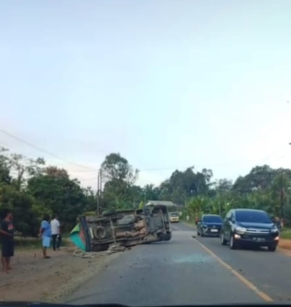 Sanggau, Kalbar – Kecelakaan tunggal terjadi di Jalan Raya sebelum Simpang Sosok, Kabupaten Sanggau, Provinsi Kalimantan Barat, pada Senin, 5 Mei 2025. Sebuah mobil pickup mengalami kecelakaan setelah ban pecah, menyebabkan sopir kehilangan kontrol dan kendaraan terbalik.