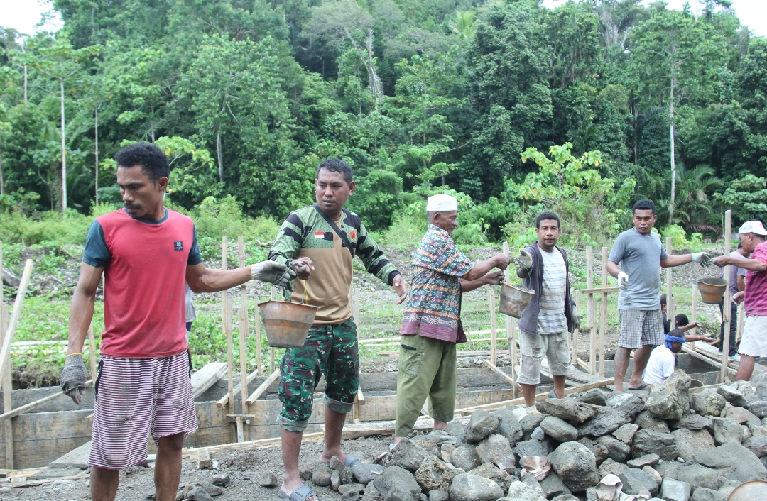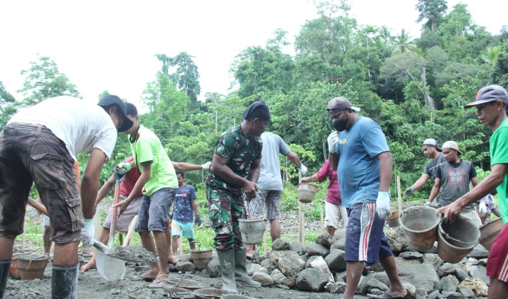 Kekompakan TNI dan Masyarakat dalam Pembangunan Talud pada Hari ke-5 TMMD Kodim 1510/Sula