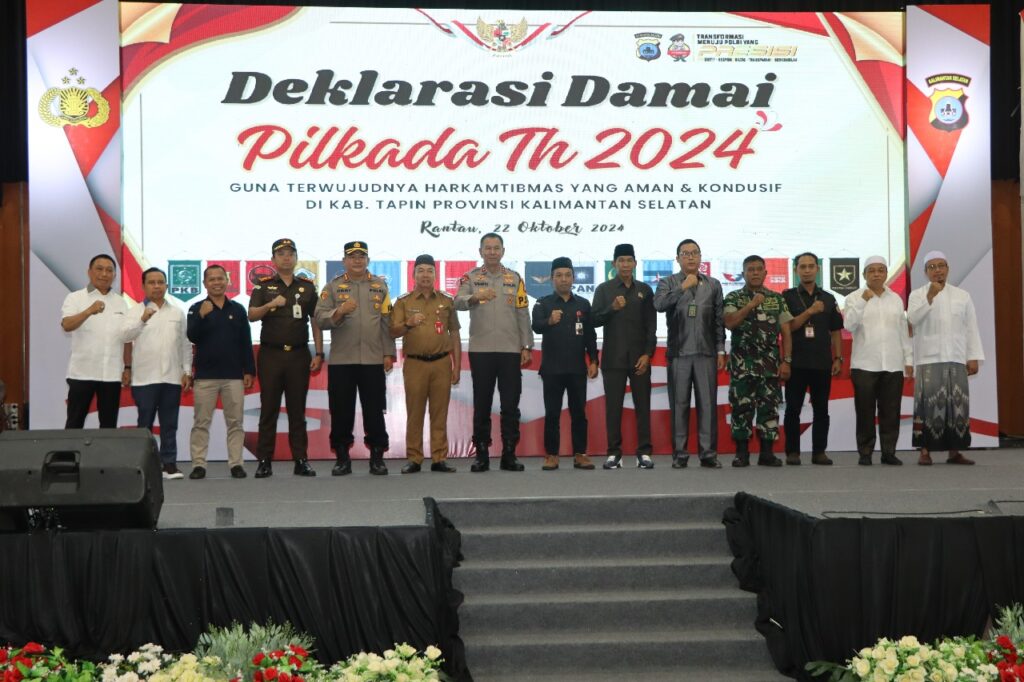 Deklarasi itu diawali dengan pembacaan sekaligus penandatanganan ikrar Pilkada Damai tahun 2024 oleh para Kandidat Cabup dan Cawabup Tapin yang disusul kemudian oleh Jajaran Forkopimda,Ketua KPU dan Bawaslu Tapin serta Kapolda Kalimantan Selatan Irjen Pol Winarto.