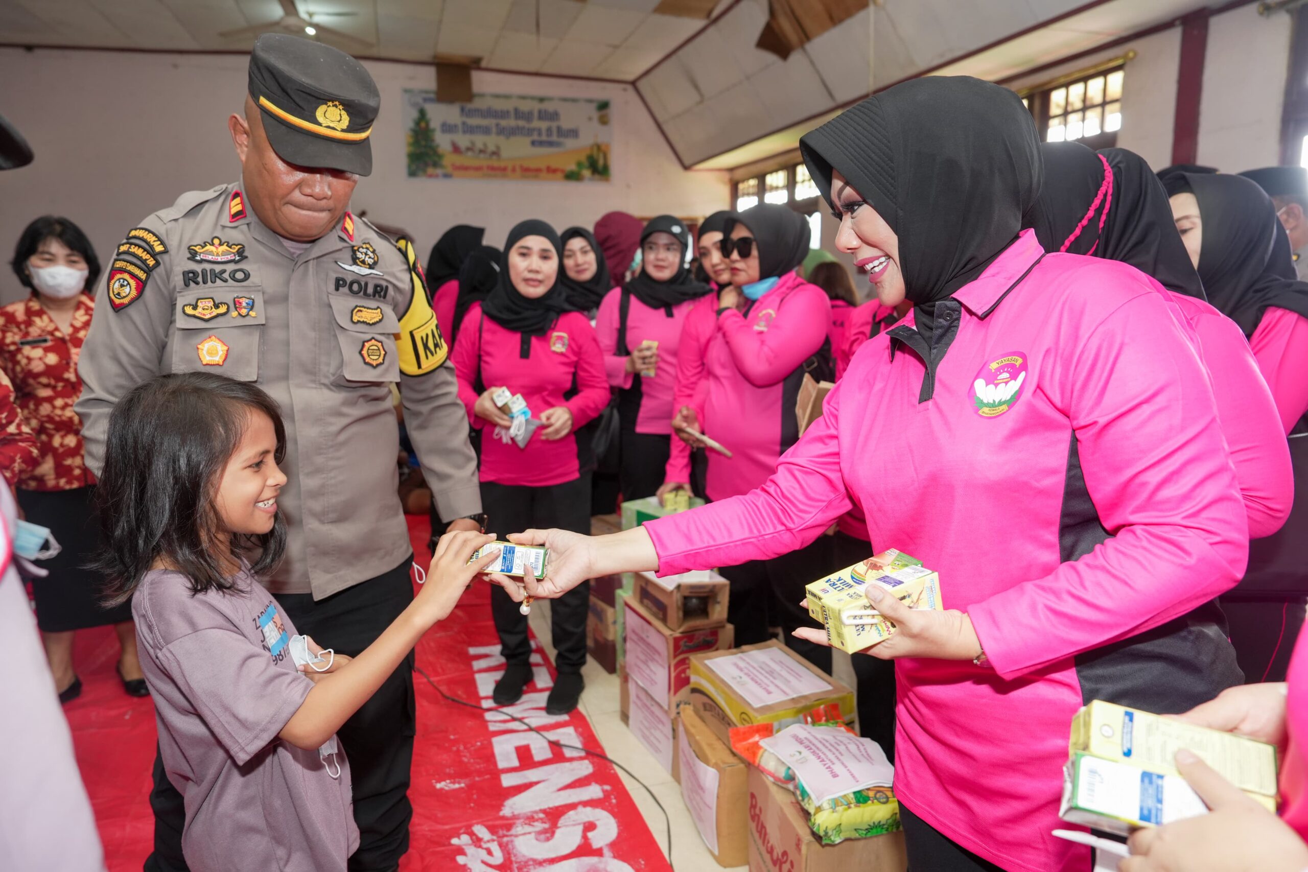 Ketua Bhayangkari Daerah Maluku Utara Ny. Diah Midi Siswoko bersama-sama dengan pengurus Bhayangkari dan Pejabat Utama Polda Maluku Utara memberikan bantuan kemanusiaan untuk pengungsi erupsi gunung Ibu di Kabupaten Halmahera Barat. Jumat (17/01).