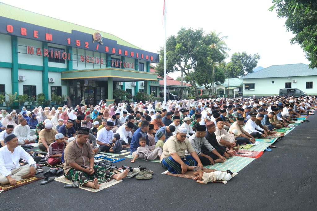 Ternate – Dalam rangka merayakan Hari Raya Idul Fitri 1445 H, Korem 152/Baabullah menggelar Sholat Idul Fitri di lapangan depan Makorem 152, Senin (31 Maret 2025). Sholat Idul Fitri ini diimami oleh Ustadz H. M. Saleh Sakola, S.Ag dan diikuti tidak hanya oleh prajurit serta keluarga besar Korem, tetapi juga oleh masyarakat setempat yang antusias hadir dalam suasana penuh kebersamaan.