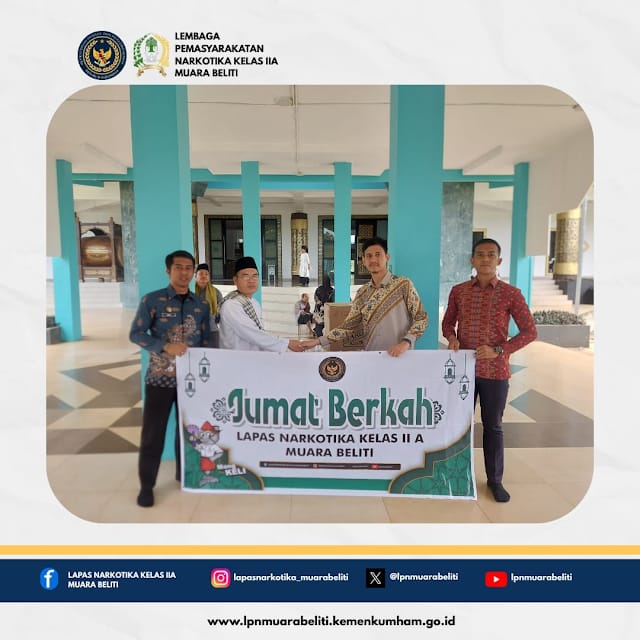 Muara Beliti – Lembaga Pemasyarakatan (Lapas) Narkotika Kelas IIA Muara Beliti kembali menggelar kegiatan Jumat Berkah di Masjid Agung Muara Beliti, Kabupaten Musi Rawas, Jumat (12/9/2025)