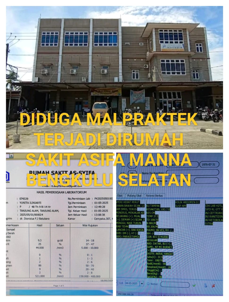 Sangat memperihatinkan dan miris seorang pasien datang ingin berobat dan menyembuhkan penyakit agar tidak menanggung derita yang berkepanjangan namun apa yang dialami seorang ibu bernama Yunita Iliniarti diduga korban Malpraktek dari sebuah Rumah Sakit swasta terkenal di Bengkulu Selatan. Dunia kesehatan kembali tercoreng oleh oknum dokter yang juga diduga tidak menjalankan oprasi sesuai Standard Oprasi Prosedur (SOP) yang berlaku layaknya melakukan oprasi bagian organ tubuh manusia yang menyakut nyawa dan kesehatan pasien.