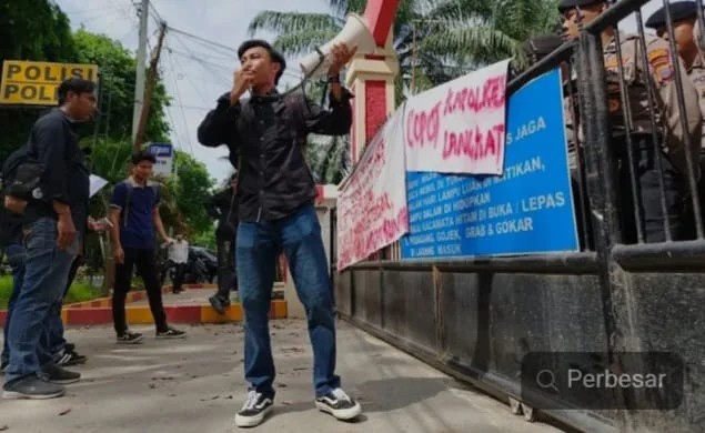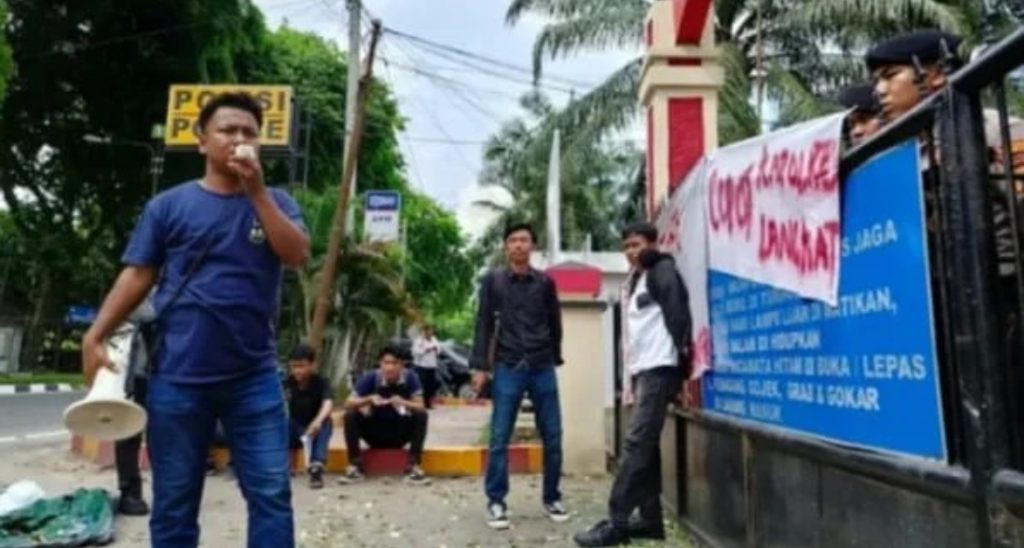 Mirisnya, dalam aksinya kelompok mahasiswa ini memasang spanduk di pagar depan Mapolres Langkat.