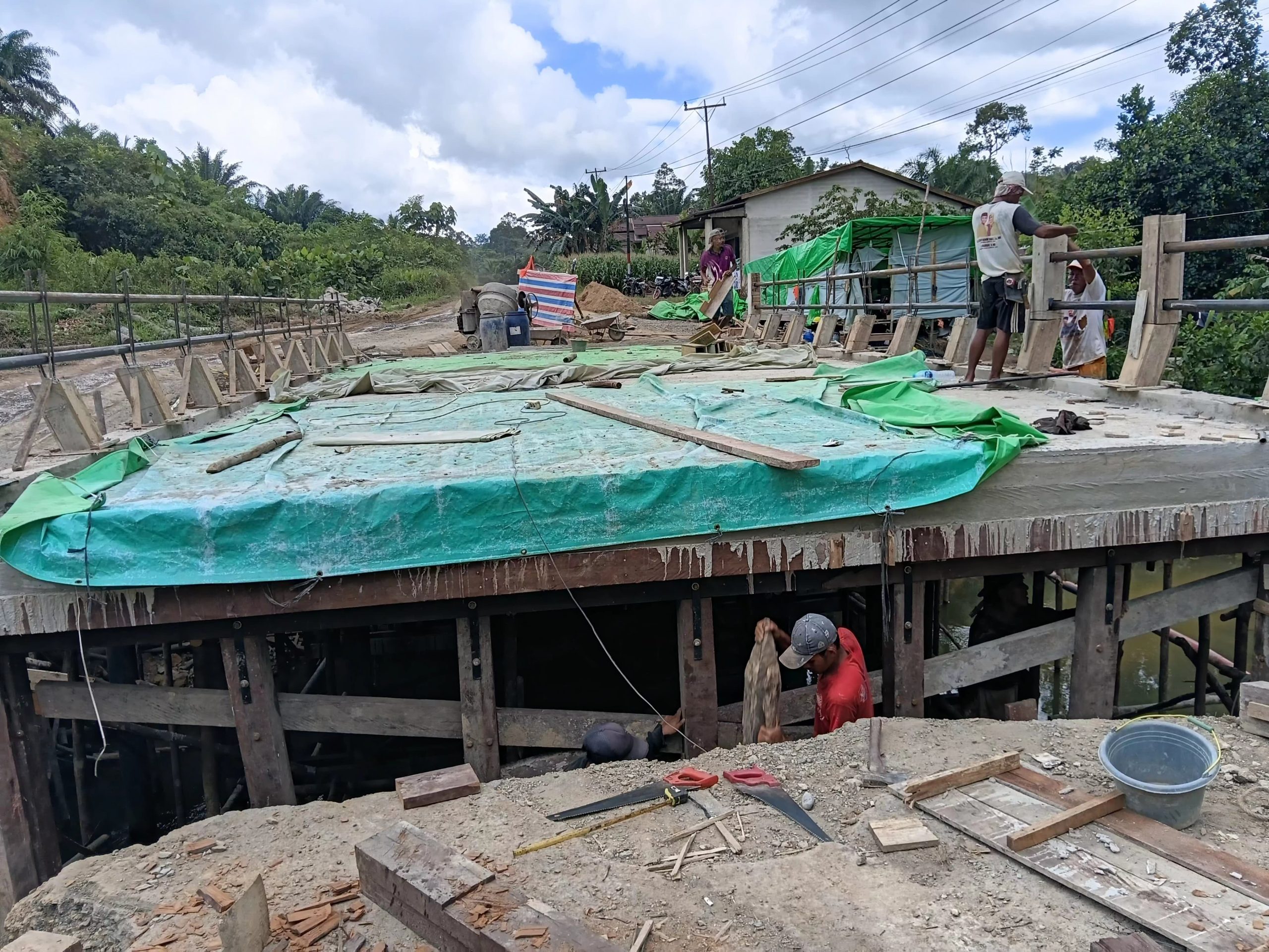 Namun, hasil pantauan awak media di lapangan mengungkapkan kenyataan yang berbeda. Struktur jembatan yang tengah dibangun terlihat masih menggunakan tiang kayu lama, yang diduga merupakan material bekas dan bukan bagian dari konstruksi jembatan komposit sebagaimana yang tertera dalam kontrak proyek. Selain itu, kualitas pengerjaan secara keseluruhan juga dipertanyakan, dengan sejumlah elemen konstruksi yang terlihat terkesan asal jadi dan tidak sesuai dengan spesifikasi teknis yang diharapkan.