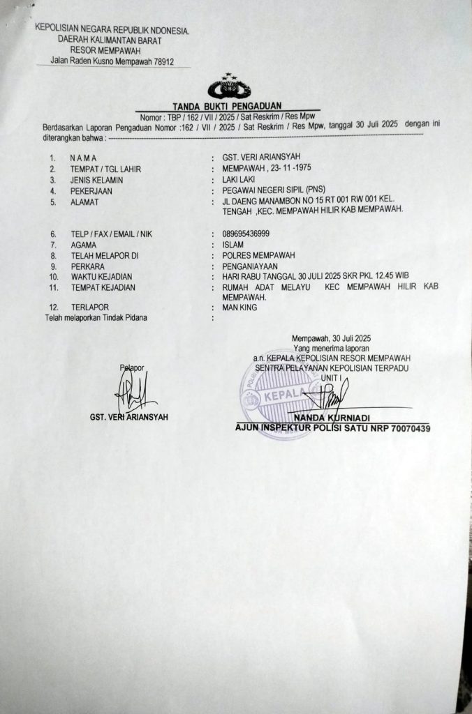 Atas aksi pemukulan telah di lakukan pelaporan Hukum Sat Reskim Mempawah no:162/VII/2025,tgl 30 juli 2025 diterima oleh Ajun Inspektur Nanda Kurniadi, namun menurut keterangan pelapor pihak kepolisian belum melakukan tindakan apapun terhadap terlapor,