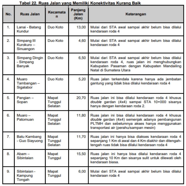1)Terdapat ruas jalan yang memiliki konektivitas jalan yang kurang memadai Pada wilayah Kabupaten Pasaman masih terdapat wilayah nagari yang belum terakses jalan darat secara optimal.