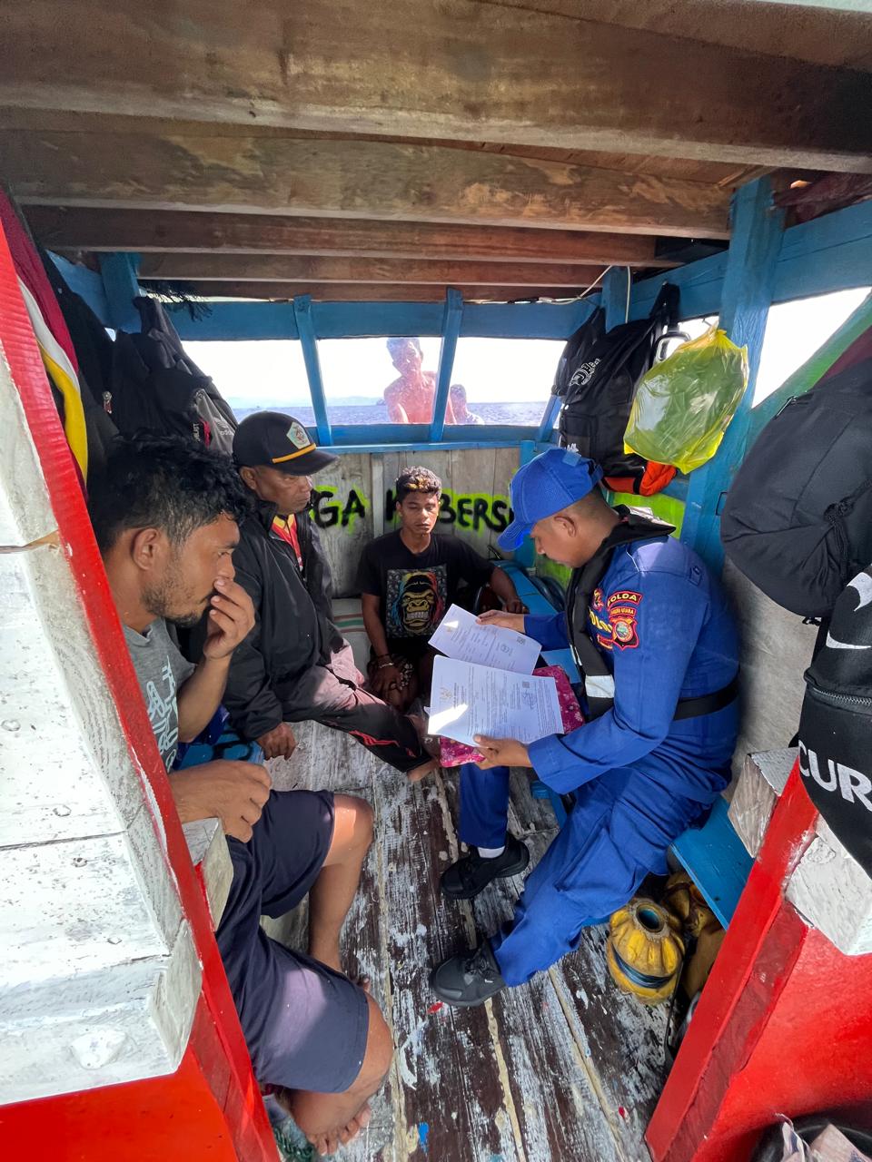 Selama patroli, petugas melakukan pemeriksaan terhadap kapal-kapal yang melintas, termasuk pengecekan dokumen dan identitas kapal guna memastikan kepatuhan terhadap peraturan pelayaran yang berlaku.