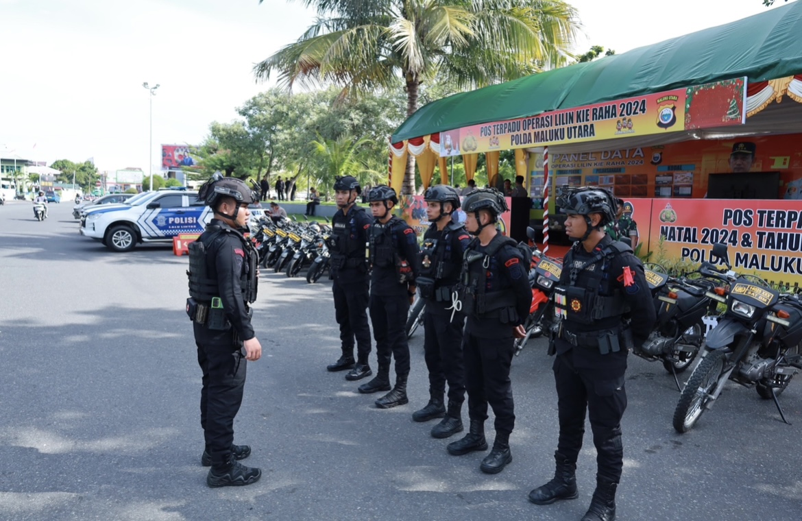 Menjelang perayaan Natal 2024 dan Tahun Baru 2025, Satbrimob Polda Maluku Utara melalui Satgas Tindak Operasi Lilin Kieraha 2024 menggelar patroli keamanan di sejumlah gereja di Kota Ternate pada Selasa (24/12/2024).