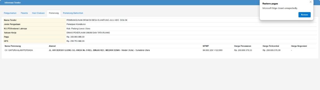 Pembangunan Sistem Penyedian Air Minum (SPAM) didesa Sijantung Julu Kecamatan Sijantung Julu Kecamatan Dolok Kabupaten Padang Lawas Utara, yang dikerjakan CV Gapura Alam Persada Tidak dapat berfungsi diduga tidak sesuai dengan Spek.
